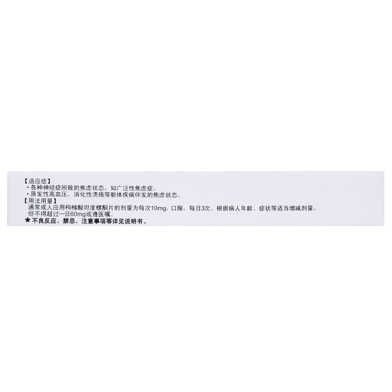 | 用法用量 | 通常成人应用枸橼酸坦度螺酮片的剂量为每次10mg,口服,每日3次。根据病人年龄、症状等适当增减剂量,但不得超过1日60mg或遵医嘱。 |