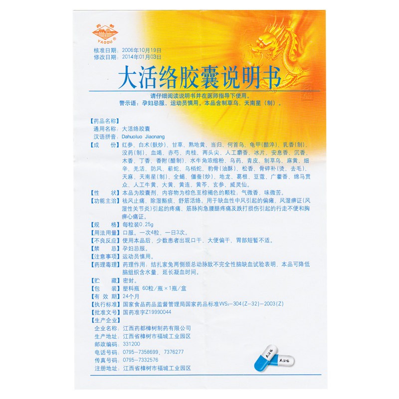 | 商品名/品牌 | 大活络胶囊/药都 |