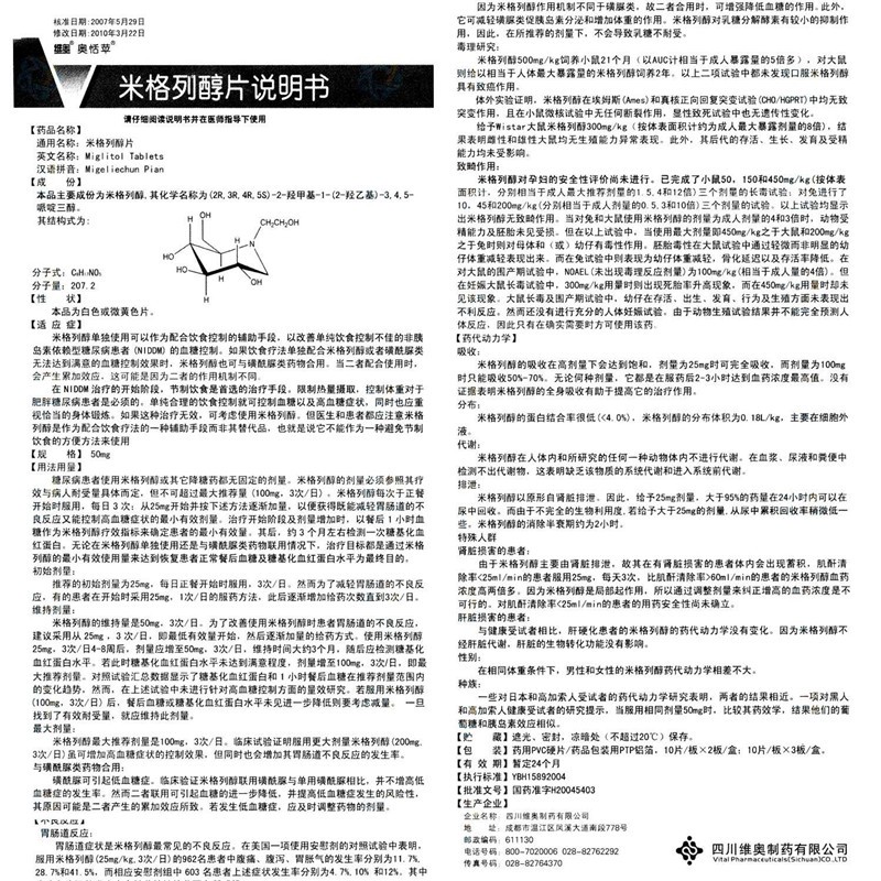 | 功效与作用 | 米格列醇单独使用可以作为配合饮食控制的辅助手段,以改善单纯饮 食控制不佳的非胰岛素依赖型糖尿病患者(niddm)的血糖控制。如果饮食疗法单独配合米格列醇或者磺酰脲类无法达到满意的血糖控制效果时,米格列醇也可 与磺酰脲类药物合用。当二者配合使用时,会产生累加效应,这可能是因为二者的作用机制不同。(详见说明书) |