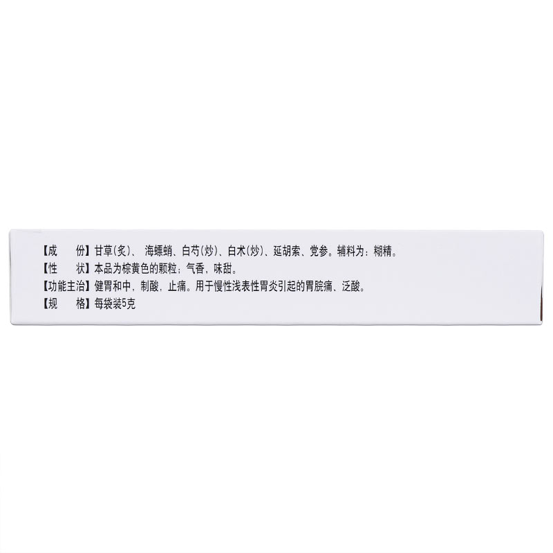 | 主要成份 | 甘草(炙)、海螵蛸、白芍(炒)、白术(炒)、延胡索、党参。辅料为糊精。 |