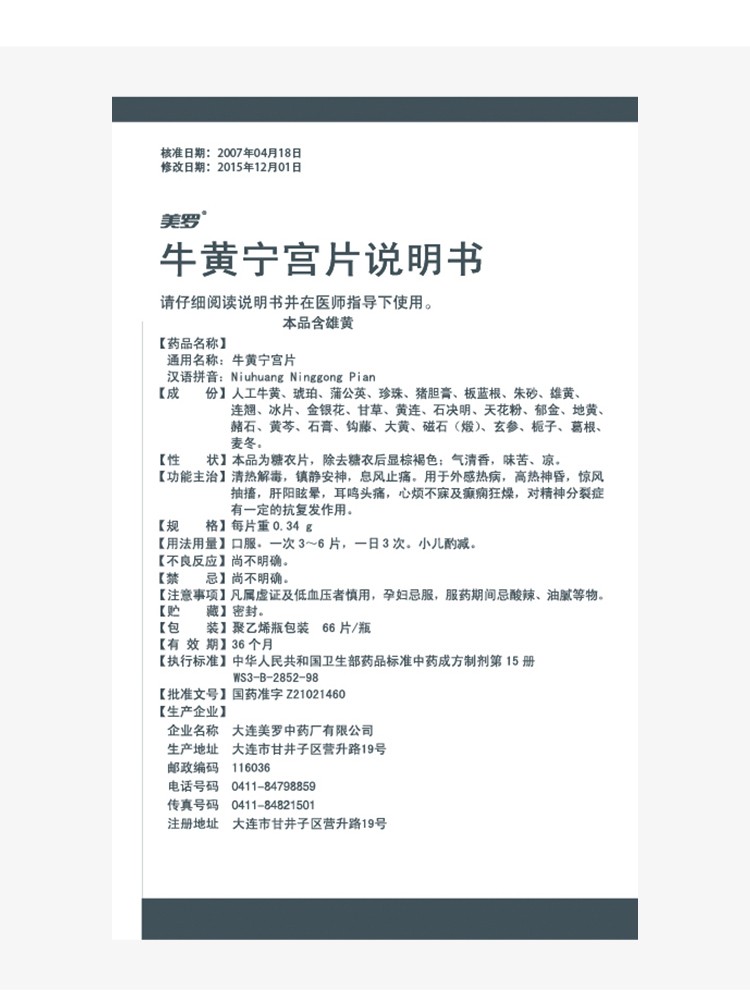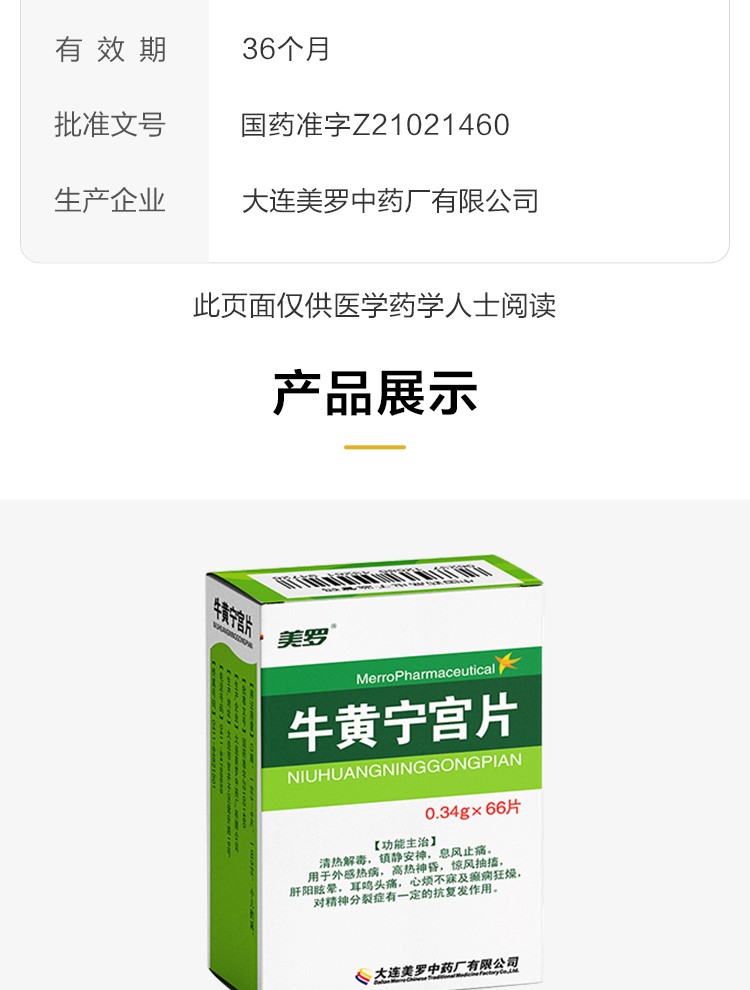 | 药品名称 | 牛黄宁宫片(美罗) |
