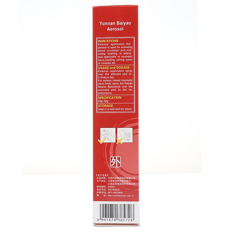 | 注意事项 | 1、本品只限于外用,切勿喷入口、眼、鼻。 2、皮肤过敏者停用。 3、小儿、年老患者应在医师指导下使用。 4、使用云南白药气雾剂保险液时先振摇,喷嘴离皮肤5~10厘米,喷射时间应限制在3~5秒钟,以防止局部冻伤。 5、皮肤受损者勿用。 6、使用时勿近明火,切勿受热,应置于阴凉处保存。 7、对酒精及本品过敏者禁用,过敏体质者慎用。 8、本品性状发生改变时禁止使用。 9、儿童必须在成人的监护下使用。 10、请将本品放在儿童不能接触的地方。 11、如正在使用其他药品,使用本品前请咨询医师或药师。 |