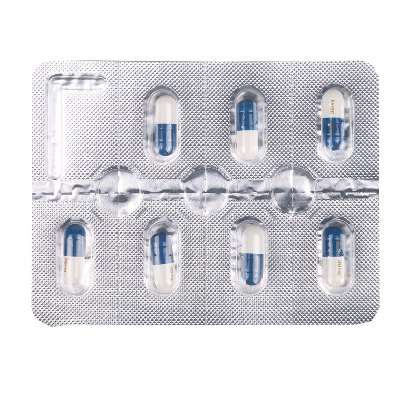 【性 状】 不透明白色囊体和蓝色囊帽,囊体上印30mg。