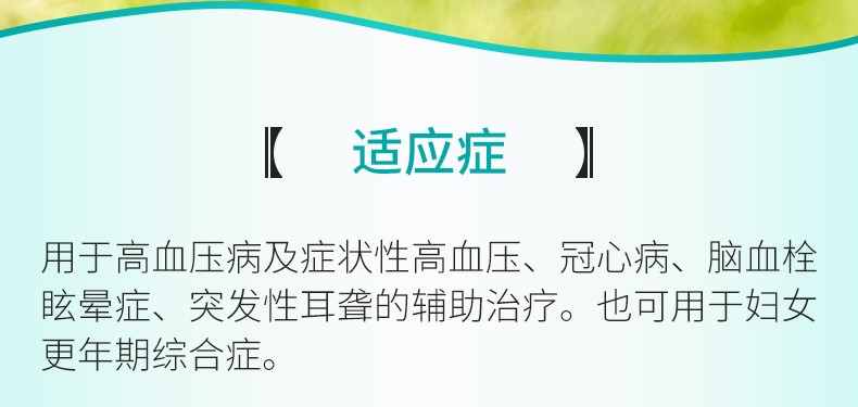 【适应症/功能主治】用于高血压病及症状性高血压、冠心病、脑血栓、眩晕症、突发性耳聋的辅助治疗。也可用于妇女更年期综合症。
