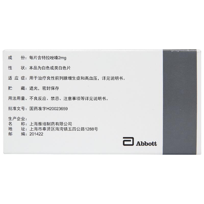 功效与作用1.用于治疗高血压,可单独使用或与其它抗高血压药同时使用。2.用于改善良性前列腺增生症患者的排尿症状,如:尿频、尿急、尿线变细、排尿困难、夜尿增多、排尿不尽感等。