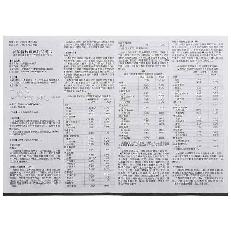 【主要成份】本品主要成份为:盐酸特拉唑嗪。其化学名为:1-(4-氨基-6,7-二甲氧基-2喹唑啉基)-4-(四氢呋喃-2-甲酰基)哌嗪,单盐酸盐二水合物。
