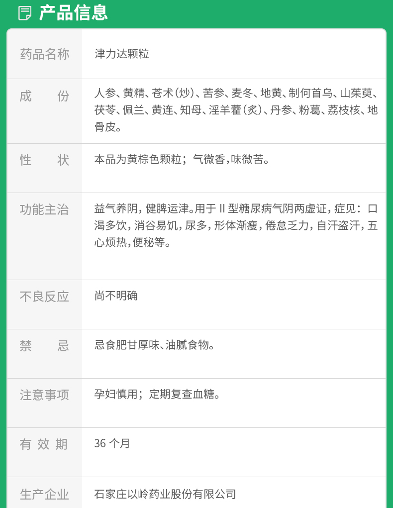 【适应症/功能主治】益气养阴,健脾运津。用于II型糖尿病气阴两虚证,症见:口渴多饮,消谷易饥,尿多,形体渐瘦,倦怠乏力,自汗盗汗,五心烦热,便秘等。