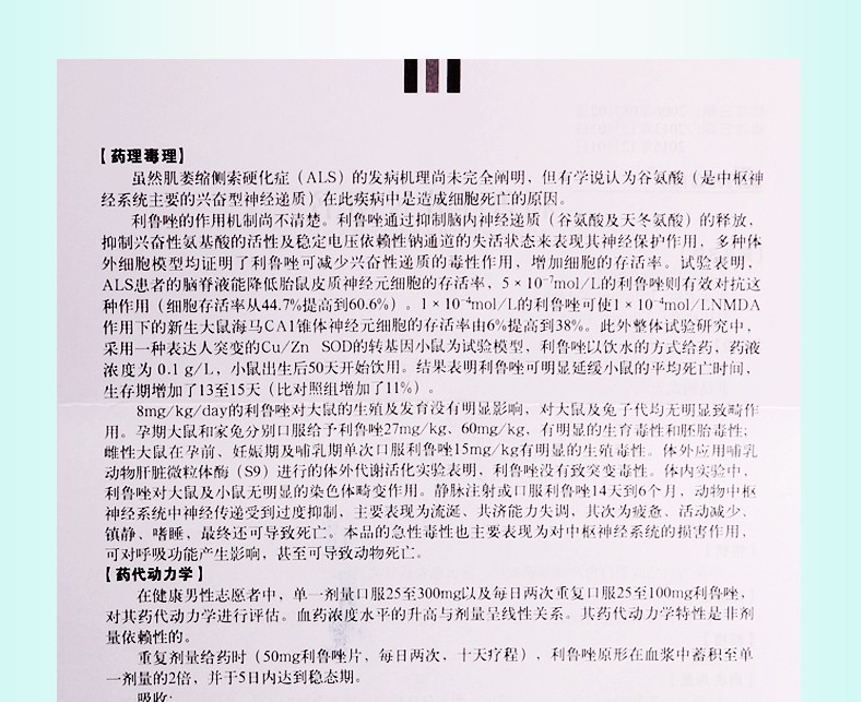 【药理作用】虽然肌萎缩侧索硬化症(ALS)的发病机理尚未完全阐明,但有学说认为谷氨酸(是中枢神经系统主要的兴奋型神经递质)在此疾病中是造成细胞死亡的原因。