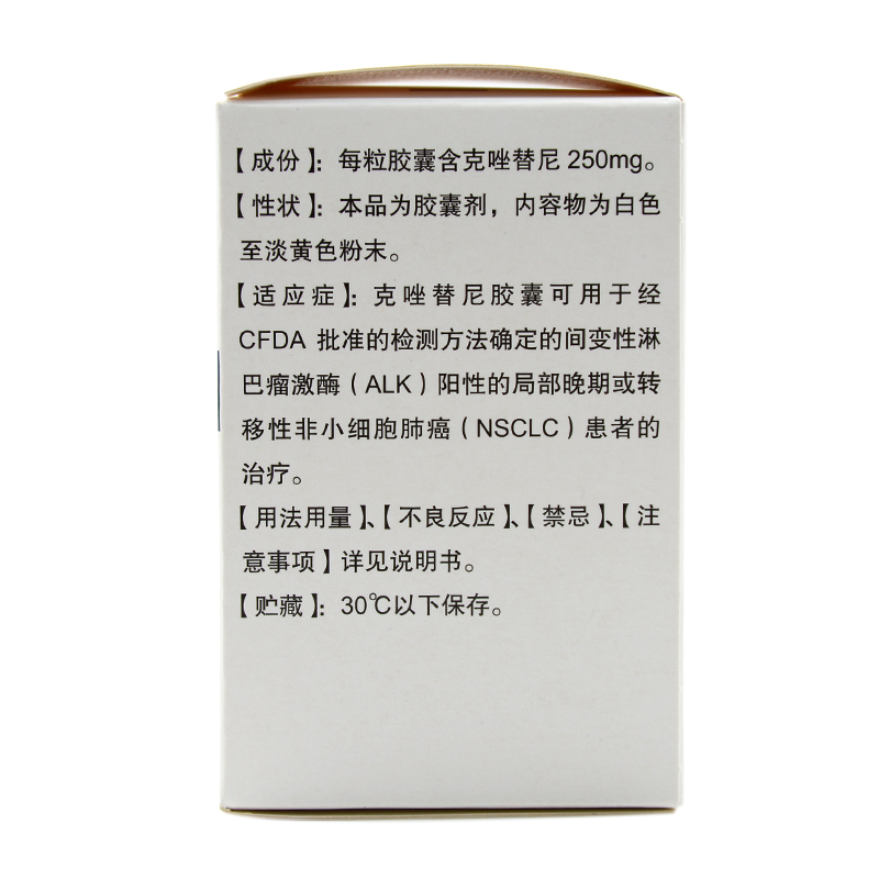 | 用法用量 | 治疗ALK阳性的非小细胞肺癌晚期的推荐剂量是250mg,一次一粒,每日2次,早晚确定时间各服1粒,一天剂量为500mg;口服,整粒胶囊吞服,不可嚼碎服用,不可溶解服用,不可打开胶囊;与食物同服或不同服均可;不可与葡萄柚子汁一起服用。 |