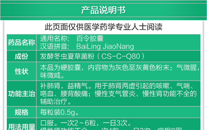 百令 百令胶囊的主要成分:发酵冬虫夏草菌粉(Cs-C-Q80)。百令 百令胶囊的适应症/功能主治:补肺肾,益精气。用于肺肾两虚引起的咳嗽、气喘、腰背酸痛;慢性支气管炎的辅助治疗。