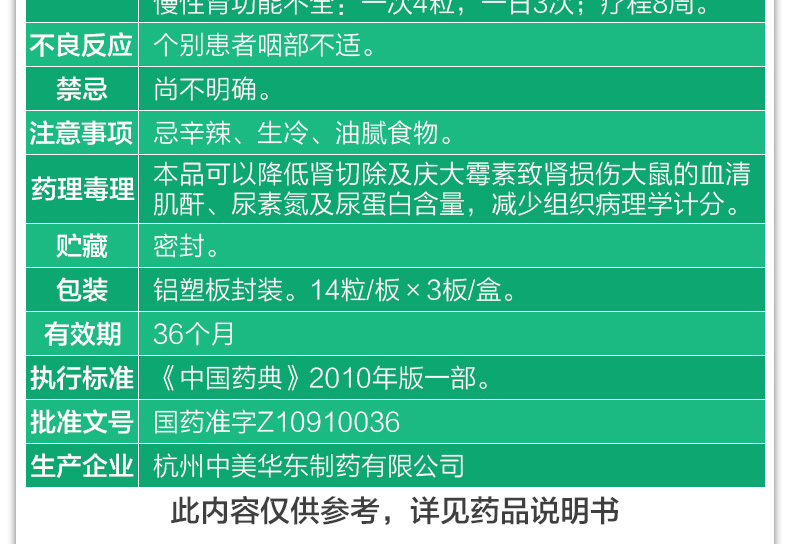 | 用法用量 | 口服。一次2~6粒,一日3次。慢性肾功能不全:一次4粒,一日3次;疗程8周。 |