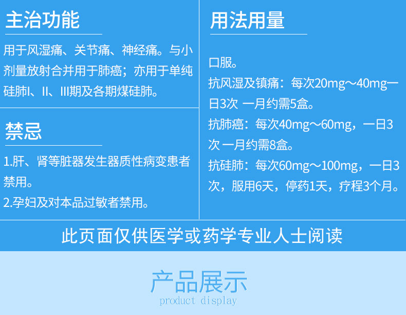 【适应症/功能主治】用于风湿痛、关节痛、神经痛。与小剂量放射合并用于肺癌;亦用于单纯硅肺I、II、III期及各期煤硅肺。