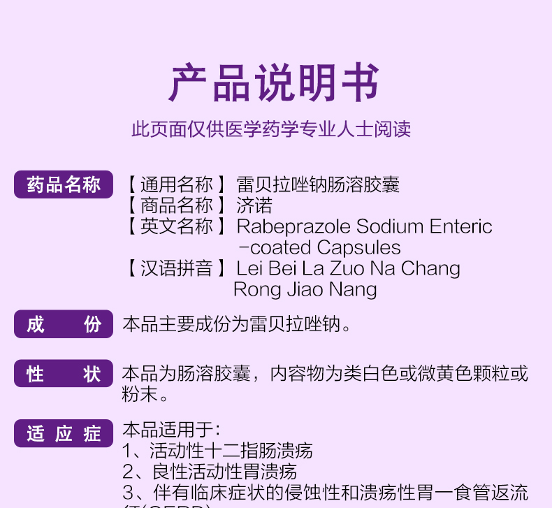 商品名称:雷贝拉唑钠肠溶胶囊(济诺)