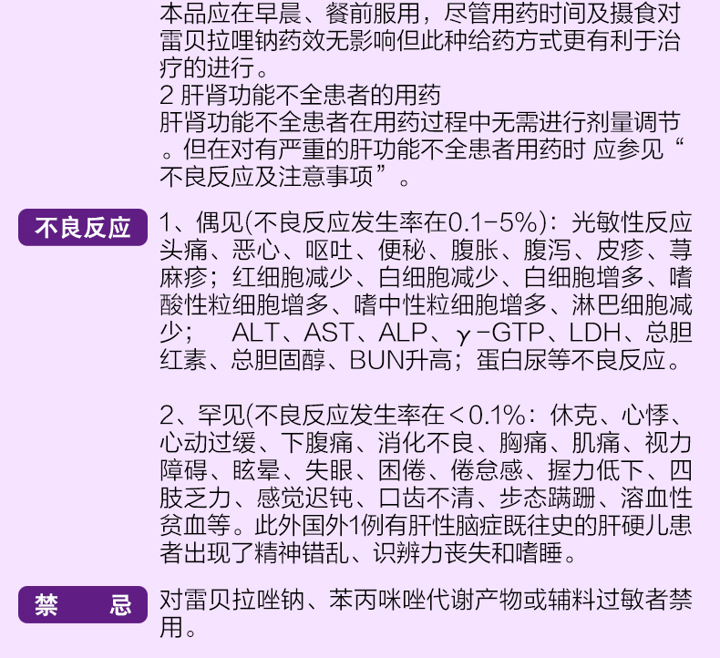 【禁 忌】禁用于对雷贝拉唑钠或处方中任何辅料有过敏的患者。有出血病史、血友病、脑溢血及严重肝、肾功能不全者禁用。