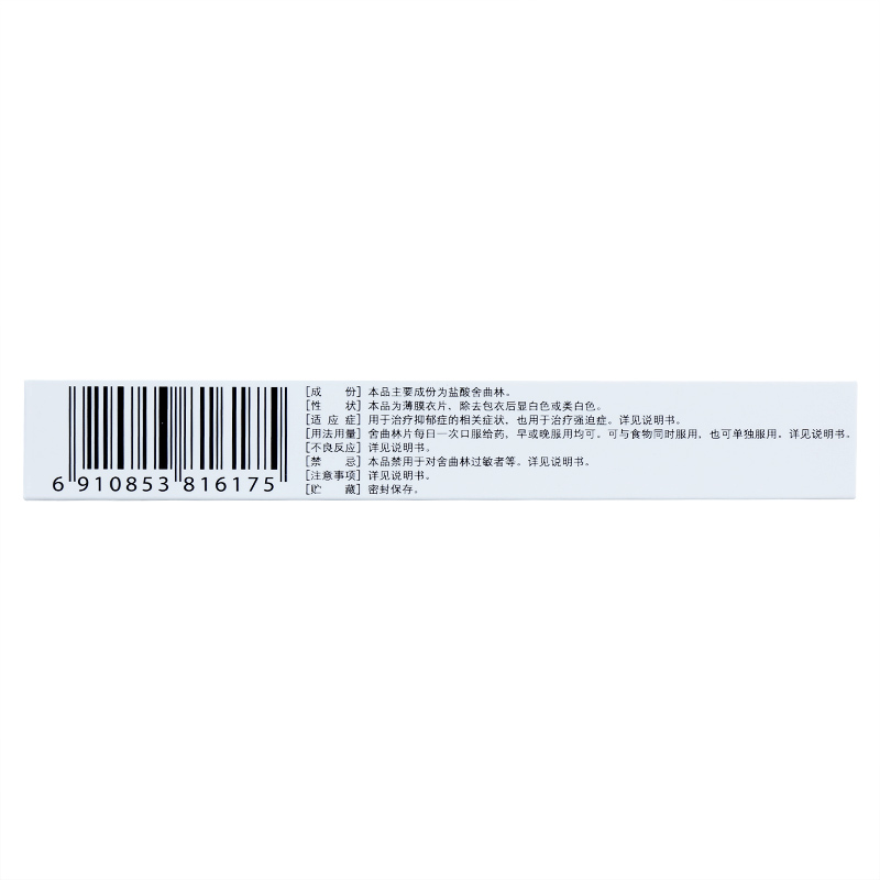 | 用法用量 | 成人每日服药一次,早或晚均可,与食物同服或不同服均可。通常治疗抑郁症和强迫症的有效剂量为50毫克/日。少数患者疗效不佳而对药物耐受较好时,可在几周内根据疗效逐渐增 |