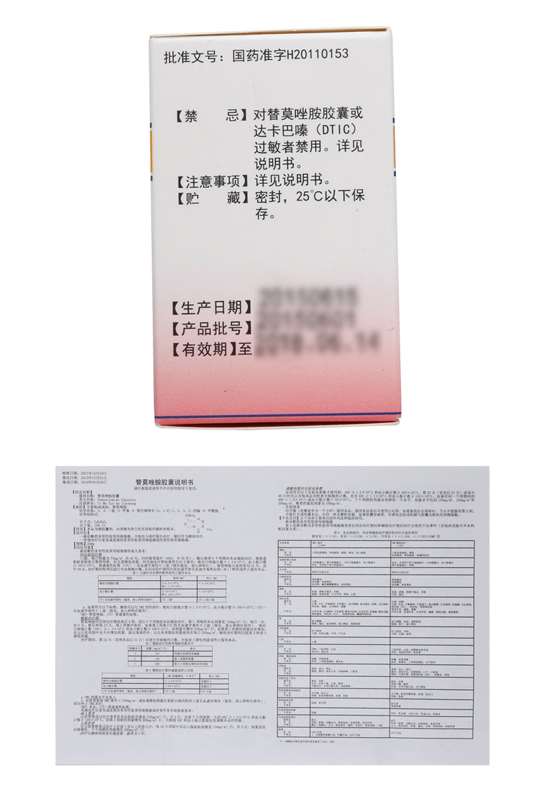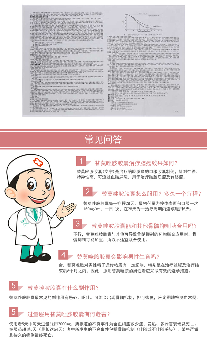 【适应症/功能主治】用于治疗新诊断的多形性胶质母细胞瘤,开始先与放疗联合治疗,随后作为辅助治疗;常规治疗后复发或进展的多形性胶质母细胞瘤或间变性星形细胞瘤。