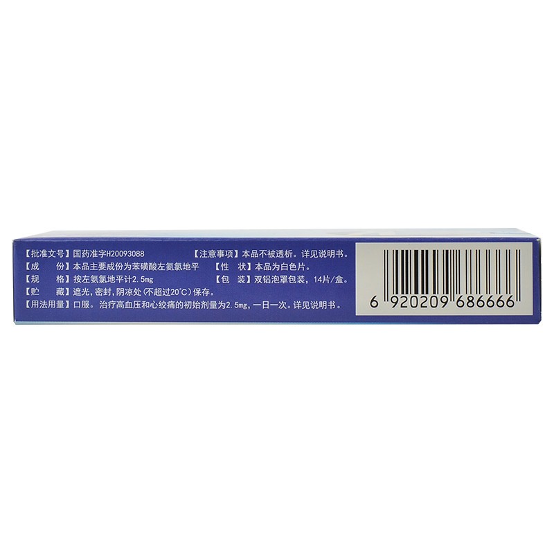 | 用法用量 | 口服: 1.治疗高血压和心绞痛的初始剂量为2.5mg,一日1次;根据患者的临床反应,可将剂量增加,最大可增至5mg,一日1次。 2.本品与噻嗪类利尿剂、β-受体阻滞剂和血管紧张素转换酶抑制剂合用时不需调剂量。 |