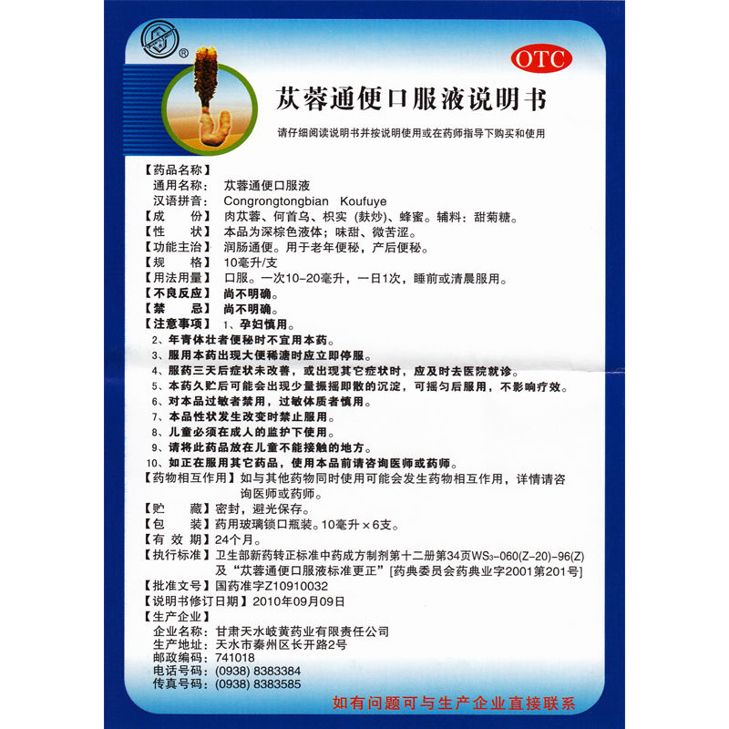 | 商品名/品牌 | 苁蓉通便口服液/天水岐黄 |