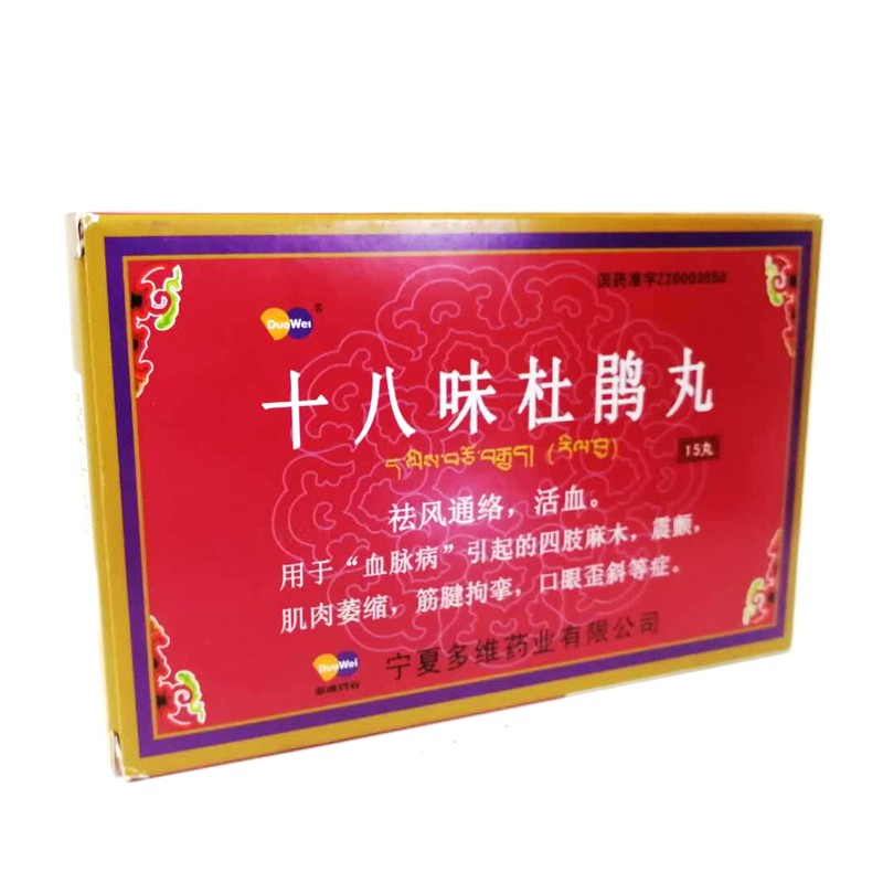 用药点评:十八味杜鹃丸是一种中药制剂,是由18味药材制成,主要是烈香杜鹃、草果、诃子、檀香、降香、余甘子、山矾叶、石灰华、藏茜草、红花、紫草茸、肉豆蔻、秦艽花等等药材,具有祛风通络、活血的功效。
