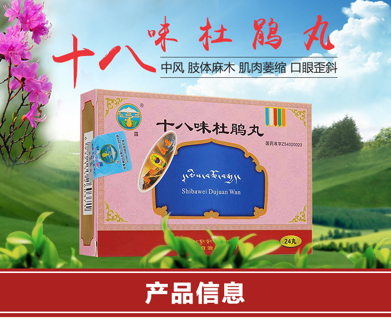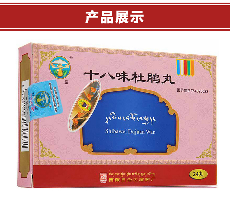 用药点评:十八味杜鹃丸是一种中药制剂,是由18味药材制成,主要是烈香杜鹃、草果、诃子、檀香、降香、余甘子、山矾叶、石灰华、藏茜草、红花、紫草茸、肉豆蔻、秦艽花等等药材,具有祛风通络、活血的功效。