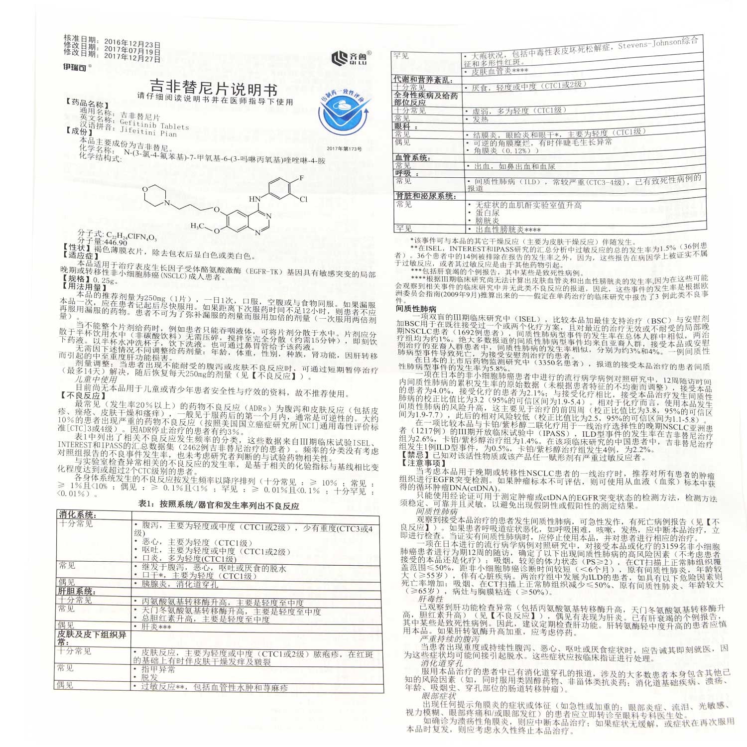 【药物相互作用】对人肝微粒体进行的体外试验证实,吉非替尼主要通过肝细胞色素P-450系统的CYP3A4代谢。所以吉非替尼可能会与诱导,抑制或为同一肝酶代谢的药物发生相互作用。动物研究表明吉非替尼很少有酶诱导作用,体外研究显示吉非替尼可有限地抑制CYP2D6。以下列出了与吉非替尼产生或可能产生有临床意义的药物相互作用的药物或药物类别:影响吉非替尼的药物;已证明的相互作用。抑制CYP3A4的药物:在健康志愿者中将吉非替尼与伊曲康唑(一种CYP3A4抑制剂)合用,吉非替尼的平均AUC升高80%。由于药物不良反应与剂量及暴露量相关,该升高可能有临床意义。虽然未进行与其他CYP3A4抑制剂相互作用的研究,但这一类药物如酮康唑,克霉唑,Ritonovir同样可能抑制吉非替尼的代谢。升高胃pH值的药物:在健康志愿者中进行临床研究,表明与能明显持续升高胃pH至≥5的药物合用,可使吉非替尼的平均AUC降低47%,这可能降低吉非替尼疗效。利福平:在健康志愿者中将吉非替尼与利福平(已知的强CYP3A4诱导剂)同时给药,吉非替尼的平均AUC比单服时降低83%。理论上可能有相互作用的药物:其他CYP3A4诱导剂,诱导CYP3A4活性的物质可增加吉非替尼的代谢并降低其血浆浓度。因此,与CYP3A4诱导剂(如苯妥因、卡马西平、巴比妥类或圣约翰草)合用可降低疗效。吉非替尼对其他药物的作用:已证明的相互作用。通过CYP2D6代谢的药物:在一项临床试验中,吉非替尼与美托洛尔(一种CYP2D6酶底物)合用,使美托洛尔的暴露量升高35%,这被认为不具有临床相关性。吉非替尼与其他由CYP2D6代谢的药物同服,可能会升高后者的血药浓度。理论上可能有相互作用的药物:华法林。虽然迄今尚未进行正规的药物相互作用研究,在一些服用华法林的患者中报告了INR增高和/或出血事件。服用华法林的患者应定期监测其凝血酶原时间或INR的改(见注意事项)。长春瑞滨:在II期临床研究中,将本品与长春瑞滨同时服用,显示本品可能会加剧长春瑞滨引起的中性白细胞减少作用。 【药理毒理】药理作用:吉非替尼是一种选择性表皮生长因子受体(EGFR)酪氨酸激酶抑制剂,该酶通常表达于上皮来源的实体瘤。吉非替尼广泛抑制异种移植于裸鼠的人肿瘤细胞的生长,抑制其血管生成,在体外,可增加人肿瘤细胞衍生系的凋亡并抑制血管生成因子的侵入和分泌。在动物试验或体外研究中已证实吉非替尼可提高化疗、放疗及激素治疗的抗肿瘤活性。毒理学研究:非临床(体外)研究资料表明吉非替尼具有抑制心脏动作电位复极化过程(如QT间期)的可能性。但由临床研究和上市后监测获得的安全性资料未提示吉非替尼对心脏有任何不良作用。致癌,致畸和生殖毒性:在基因突变分析(细菌和体外哺乳动物细胞)和裂解试验(体外哺乳动物细胞和体内大鼠微核试验)中,吉非替尼未显示基因毒性作用。在交配前4周至妊娠7天期间给予吉非替尼20mg/kg/天(按体表面积计为临床用药剂量的0.7倍),可对雌鼠排卵产生影响 ,导致黄体量下降。在器官发生期给予可产生母体毒性剂量的吉非替尼,在大鼠中可观察到成骨不全的发生率升高,在家兔中可观察到胎儿体重下降。在大鼠中未观察到畸型,仅在产生严重母体毒性的剂量下可在家兔中观察到畸型。当给予哺乳大鼠口服5mg/kg吉非替尼(按体表面积计为临床用药剂量的0.2倍),吉非替尼及某些代谢产物广泛分泌入乳汁。在大鼠妊娠及分娩期间给于吉非替尼20mg/kg/天(按体表面积计为临床用药剂量的0.7倍)的剂量,可减少幼鼠的存活率。