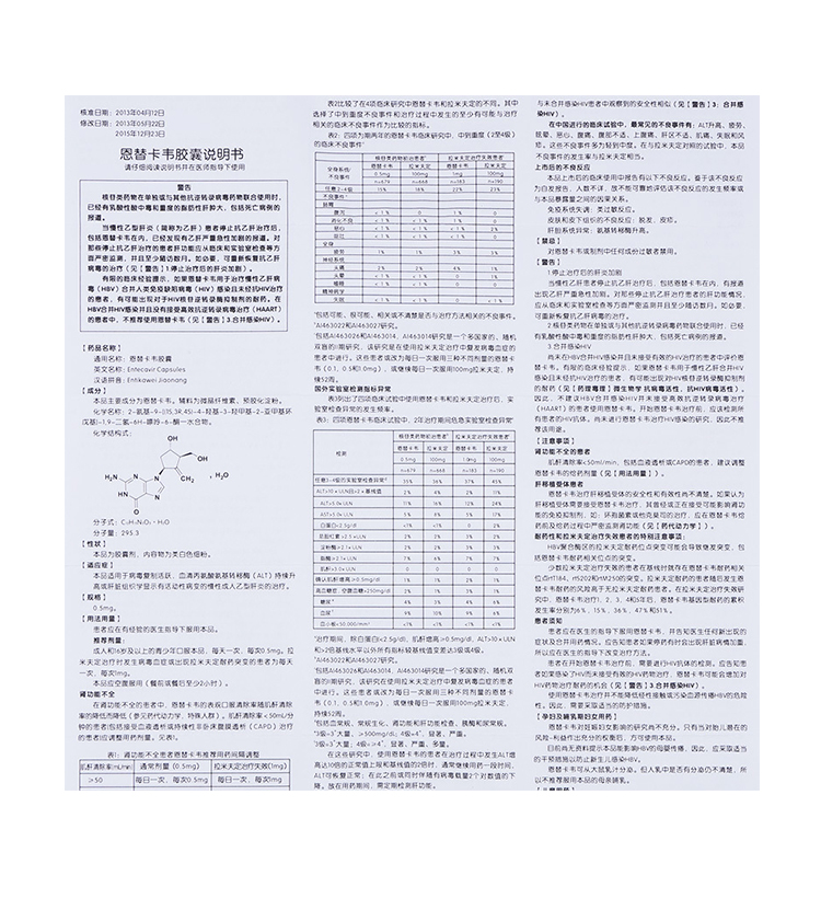 | 副作用 | 1.在国外进行的研究中,本品最常见的不良事件有:头痛、疲劳、眩晕、恶心。 2.拉米夫定治疗的患者普遍出现的不良事件有:头痛、疲劳、眩晕。在这4项研究中,分别有1%的恩替卡韦治疗的患者和4%拉米夫定治疗的患者由于不良事件和实验室检测指标异常而退出研究。 |