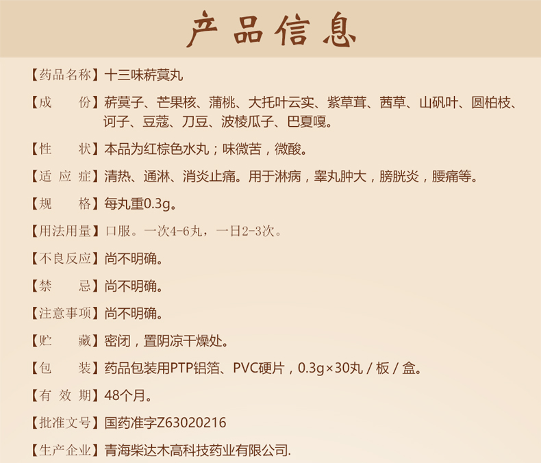 【药品成份】菥蓂子、芒果核、大托叶云实、紫草茸、茜草、山矾叶、圆柏枝、诃子、豆蔻、刀豆波棱瓜子、巴夏嘎等十三味。