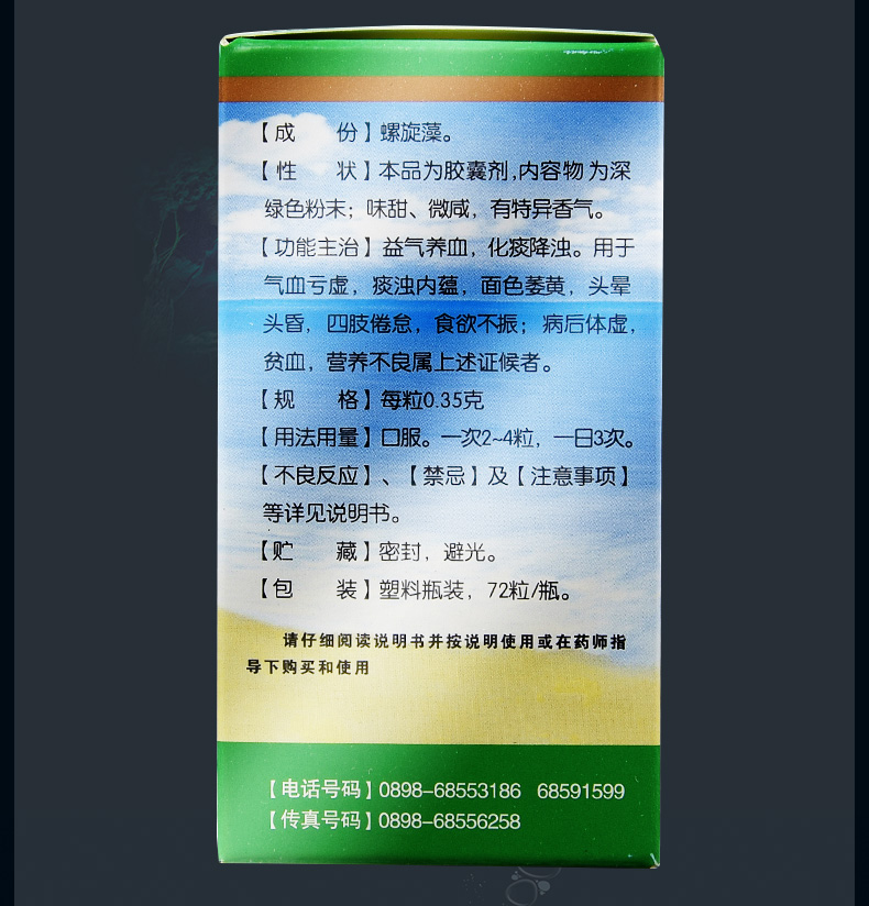 【性 状】本品为胶囊剂,内容物为深绿色粉末;味甜、微咸,有特异香气。