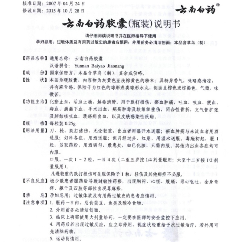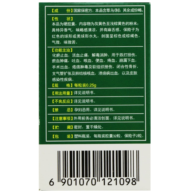 用法用量刀、枪、跌打诸伤,无论轻重,出血者用温开水送服;瘀血肿痛与未流血者用酒送服;妇科各症,用酒送服;但月经过多、红崩用温开水送服。毒疮初起,服1粒,另取药粉用酒调匀,敷患处;如已化脓,只需内服。其他内出血各症均可内服。口服,一次1~2粒,一日4次(2至5岁按1/4剂量服用;6至12岁按1/2剂量服用)。凡遇较重之跌打损伤可先服保险子1粒,轻伤及其他病症不必服。