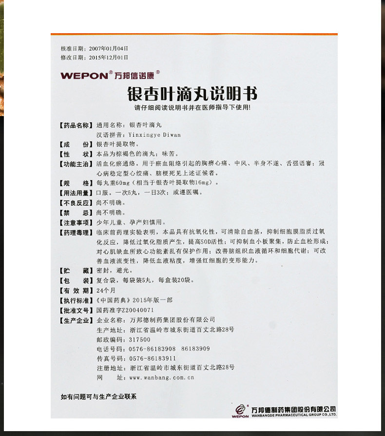 名 称:银杏叶滴丸