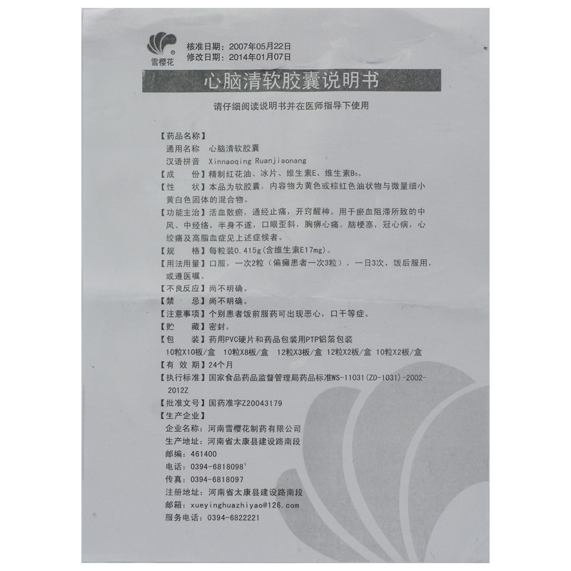 | 药品名称 | 心脑清软胶囊(雪樱花) |