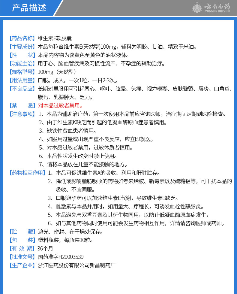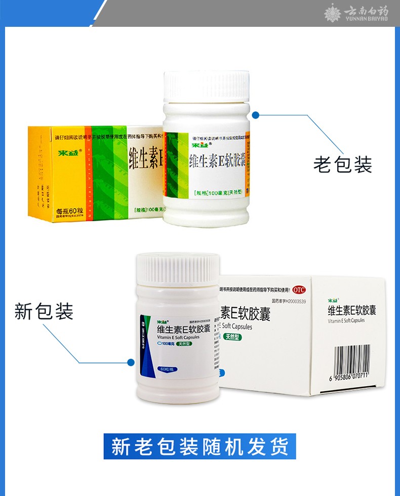 【药物相互作用】1.本品可促进维生素a的吸收,利用和肝脏贮存。 2.降低或影响脂肪吸收的药物,如考来烯胺、新霉素以及硫糖铝等,可干扰本品的吸收,不宜同服。 3.口服避孕药可以加速维生素e代谢,导致维生素e缺乏。 4.雌激素与本品并用时,如用量大,疗程长,可诱发血栓性静脉炎。 5.本品应避免与双香豆素及其衍生物同用。以防止低凝血酶原血症发生。 6.如正在服用其他药品,使用本品前请咨询医师或药师。