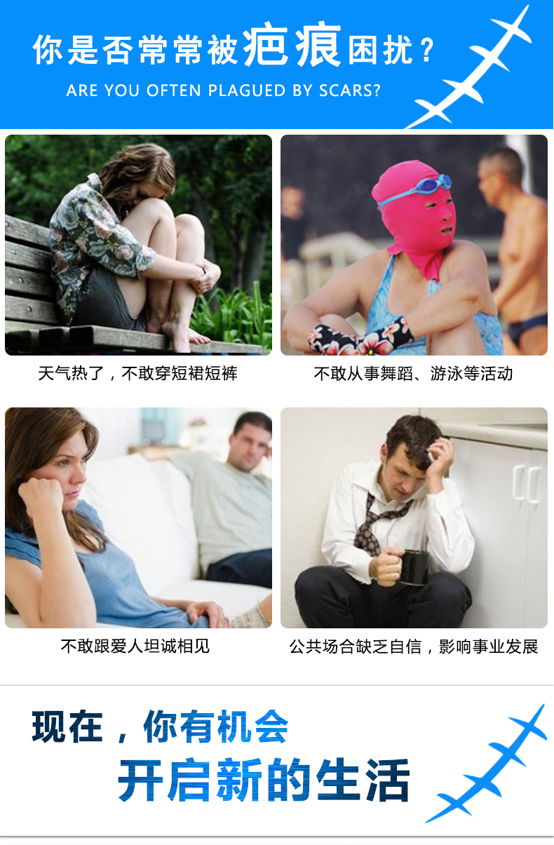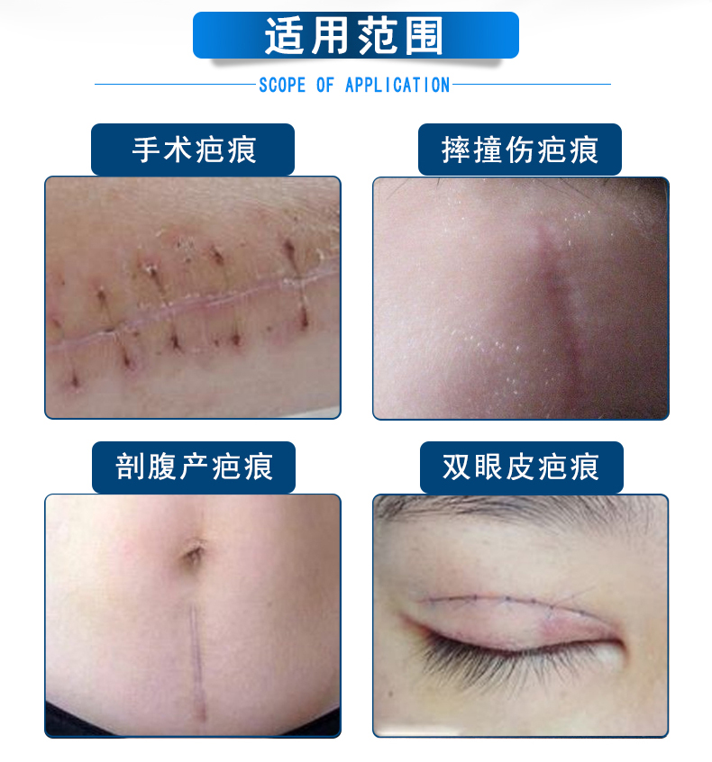 【功能】 该产品用于处理旧的或新的,由烧伤、一般外科手术和外伤导致的疤痕造成的肥厚性瘢痕和瘢痕疙瘩。