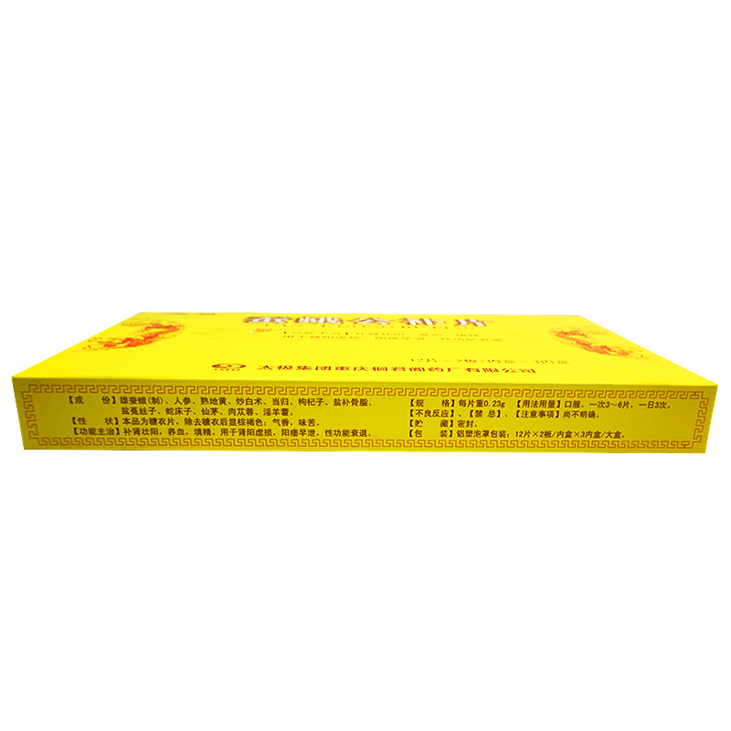 | 主要成份 | 雄蚕蛾 人参 熟地黄 白术 当归 枸杞子 补骨脂 菟丝子 蛇床子 仙茅 肉苁蓉 淫羊藿 |