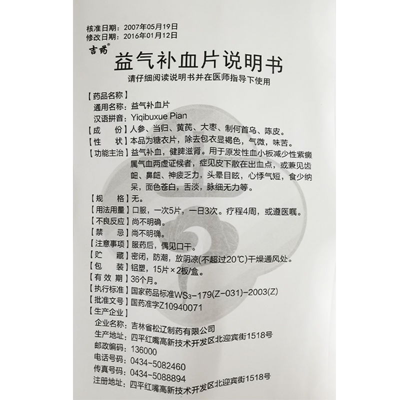 【适应症/功能主治】益气补血,健脾滋肾。用于原发性血小板减少性紫癜属气血两虚证候者,症见皮下散在出血点,或兼见齿衄、鼻衄、神疲乏力,头晕目眩,心悸气短,食少纳呆,面色苍白,舌淡,脉细无力等。