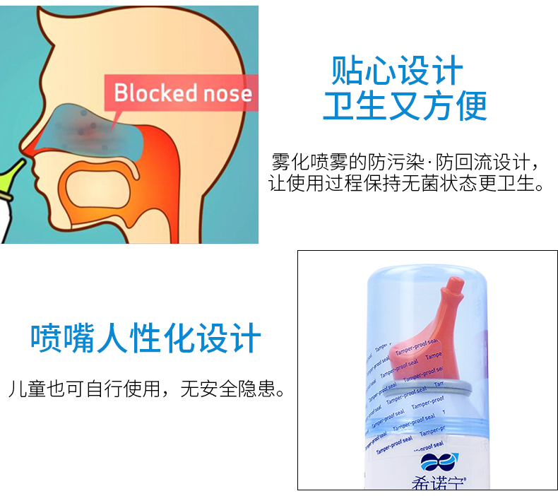 【注意事项】 1.幼儿及儿童使用时需有成人帮助(小孩使用时,喷嘴不需伸进鼻孔)。 2.六个月以下婴儿使用遵医嘱。 3.为避免污染,开封后应尽快使用。
