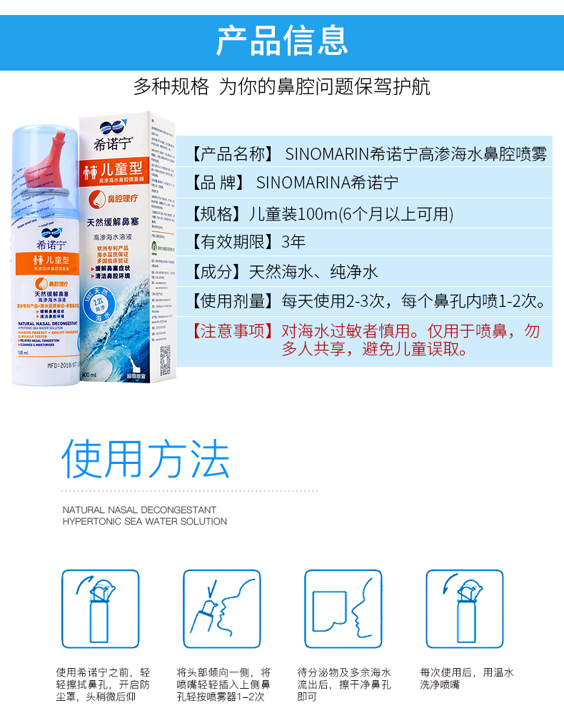 | 注意事项 | 1.幼儿及儿童使用时需有成人帮助(小孩使用时,喷嘴不需伸进鼻孔)。 2.六个月以下婴儿使用遵医嘱。 3.为避免污染,开封后应尽快使用。 |