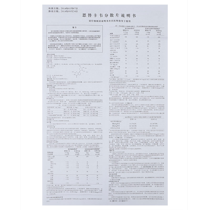 | 注意事项 | 1.肌酐清除率<50ml/min,包括血透析或capd的患者,建议调整恩替卡韦的给药剂量。 2.恩替卡韦治疗肝移植受体的安全性和有效性尚不清楚。如果认为肝移植受体需要接受恩替卡韦治疗,其曾经或正在接受可能影响肾功能的免疫抑制,如:环孢菌素或他克莫司的治疗,应在恩替卡韦给药前及给药过程中严密监测肾功能。 3.患者应在医生的指导下服用恩替卡韦,并告知医生任何新出现的症状及合并用药情况。应告知患者如果停药有时会出现肝脏病情加重,所以应在医生的指导下改变治疗方法。? 4.患者在开始恩替卡韦治疗前,需要进行hiv抗体的检测。应告知患者如果感染了hiv而未接受有效的hiv药物治疗,恩替卡韦可能会增加对hiv药物治疗耐药的机会。详见内包装说明书。 |