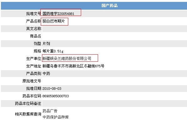 驱白巴布期片)的批准文号为:国药准字Z20054981