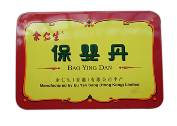 记者对比发现,在药店销售的保婴丹与记者在母婴店看到的保婴丹外包装一样。红黄色的铁盒子上印的全是繁体字。在盒子上方的左下角印着“中成药注册编号:HKP-01356”字样,而在盒子的底部印着“保婴丹(香港版)”字样。