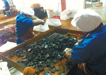 卤水池外分别连接了5个14米长的卤水槽,水槽里泡满了豆腐。从卤水里出来的豆腐颜色黝黑,没多大臭味。钱勇军说,“泡过卤水的豆腐,用水清洗一遍后就会密封放入冷库。”